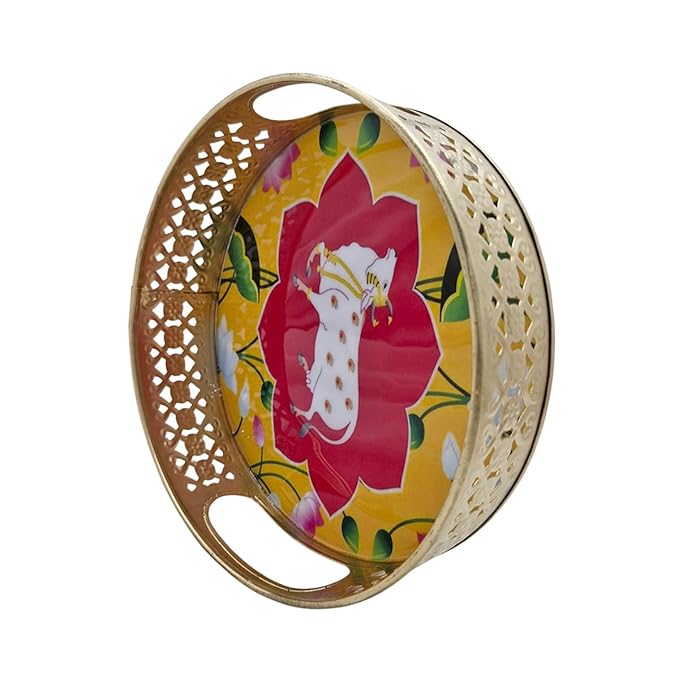 - 【DESIGN】Handmade tray sets adorned with exquisite Pichwai art, usually decorated with colorful hand-painted designs or carvings that highlight traditional motifs.