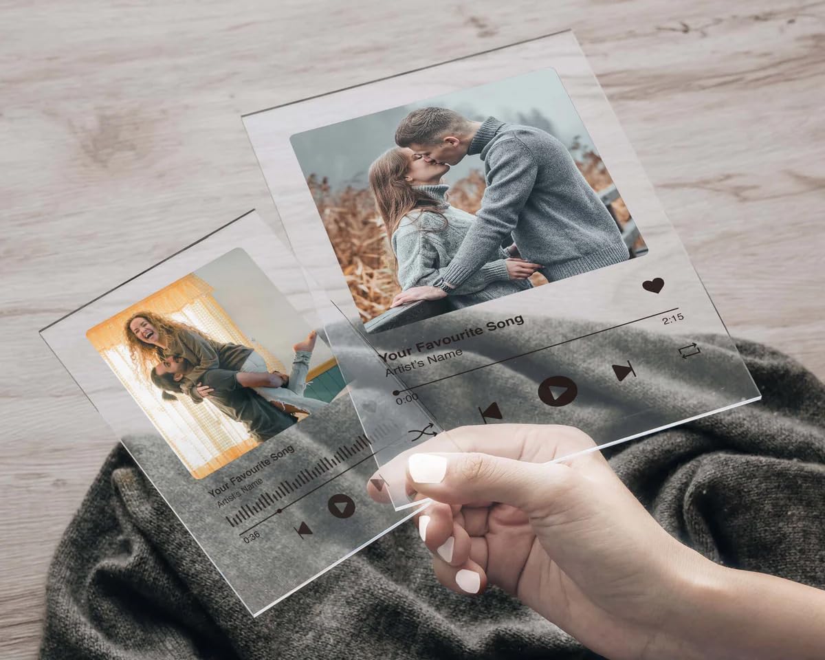 Customize your own personalized photo song music album cover which is perfect for displaying on a stand to commemorate anniversaries, enjoy with friends and family, and cherish memories. Simply select your desired song or share a heartfelt message, which we'll present as if you both were the featured artists on an album cover.Exclusive use of 3mm imported A-grade acrylic, ensuring clarity, durability, and a touch of sophistication to your displays. Premium high-quality wood stand, meticulously crafted to complement your frame with timeless elegance and durability.High-quality metal stand, meticulously engineered to provide stability and style for your display needs.